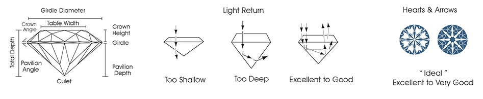 While nature determined the color and clarity of a natural diamond, man is responsible for the cut quality which brings it to life. The planning, proportions, cutting precision and details of finish determine how brilliant, dispersive and scintillating the diamond will be. If the cutting factors under man’s control are not optimized, the appearance of the diamond can be adversely affected.