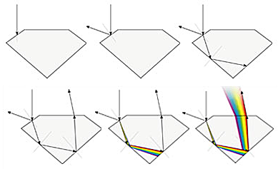 When a ray of light touches the surface, part of it is reflected back. This is called external refraction. The rest of the ray penetrates the stone and moves through it. This is known as refraction. The part of the ray reflected back to the surface exits, broken into spectral colors in a prism-like effect. This is known as dispersion. All of these elements contribute to the appearance of a diamond.